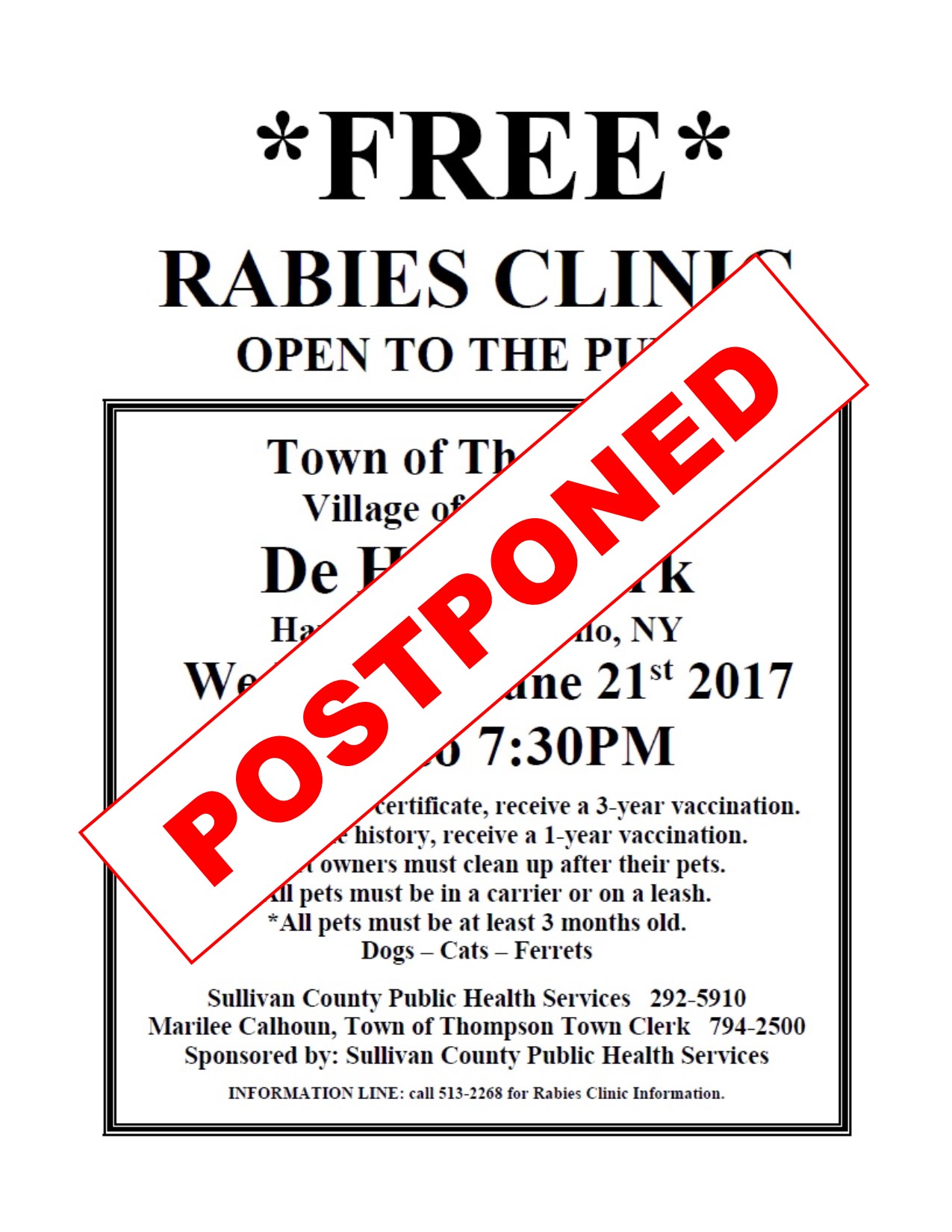 Due to unforeseen circumstances, the Rabies Clinic scheduled for Wednesday, June 21 at De Hoyos Park in Monticello must be postponed. Further information, including a rescheduled date, will be forthcoming.
